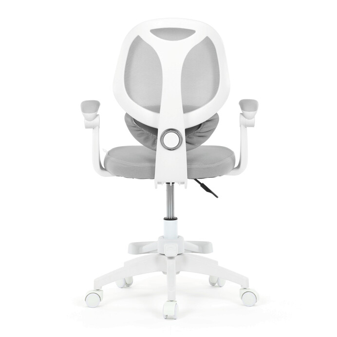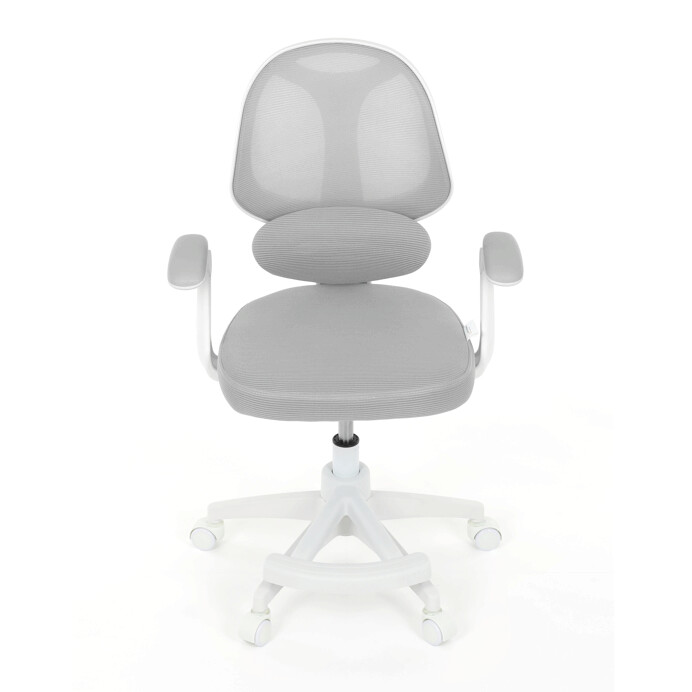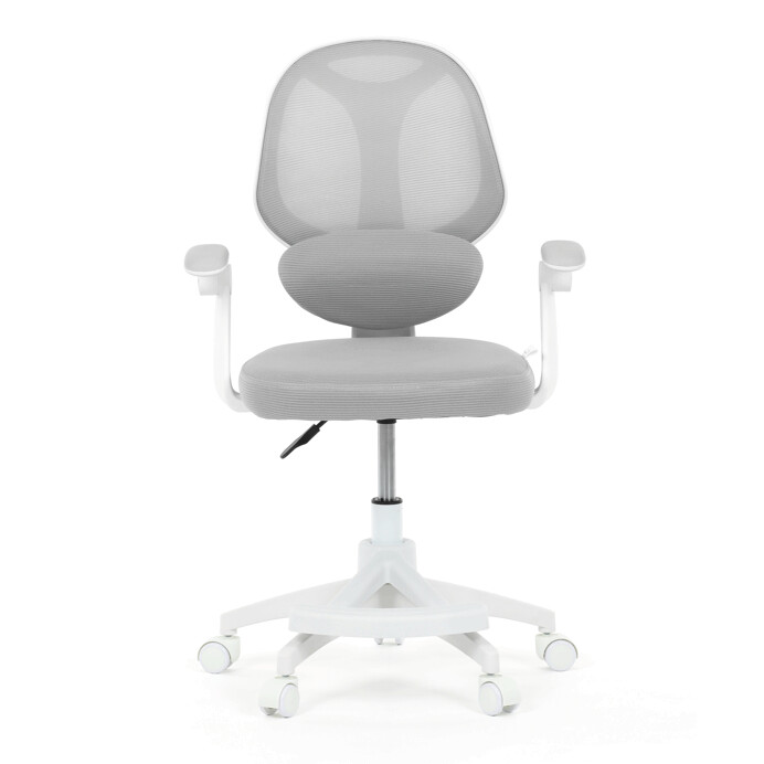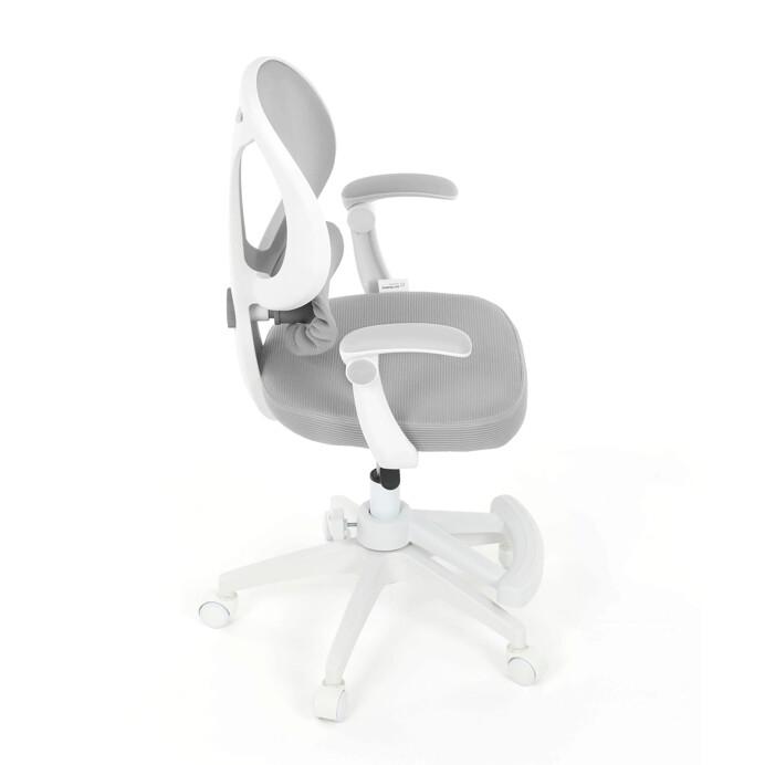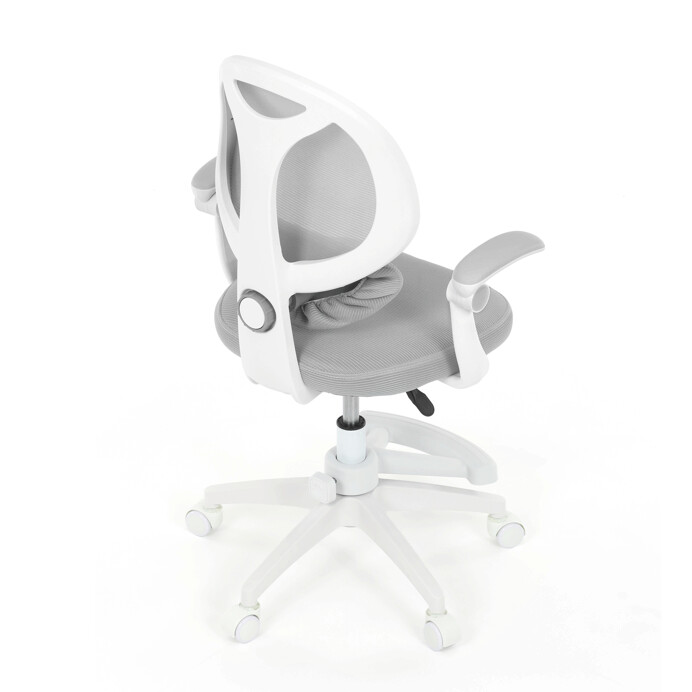 Detská kancelárska stolička v sivej sieťovine ponúka pohodlné a zdravé sedenie vďaka ergonomicky tvarovanému operadlu s nastaviteľnou bedrovou opierkou, ktorá podporuje správne držanie tela. Sedák je vyplnený mäkkou penou a potiahnutý priedušným materiálom, ktorý zabezpečuje cirkuláciu vzduchu počas dlhšieho používania. Odklápacie podrúčky umožňujú jednoduché prispôsobenie priestoru a lepšiu manipuláciu so stoličkou. Plastový kríž v bielej farbe je vybavený kolieskami vhodnými na hladké povrchy a zaisťuje stabilitu aj mobilitu. Výškovo nastaviteľný mechanizmus umožňuje individuálne nastavenie výšky sedáka podľa potreby dieťaťa.