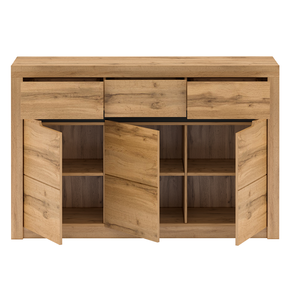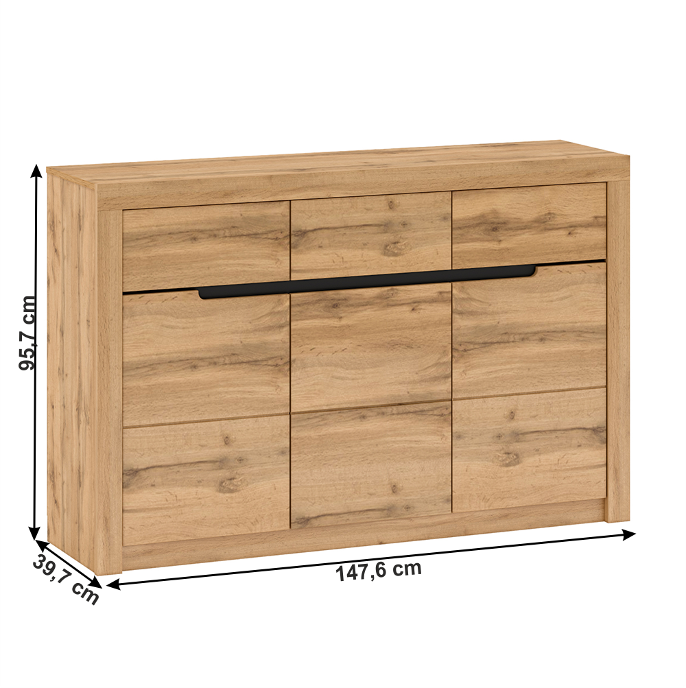 Materiál: DTD laminovaná/ MDF fóliovaná Farba: dub wotan Rozmery (ŠxHxV): 147,6x39,7x95,7 cm Hrúbka materiálu korpus: 16 mm Hrúbka materiálu dvierka: 19 mm Trojdverová S policami Tri šuplíky Dodávané v demonte