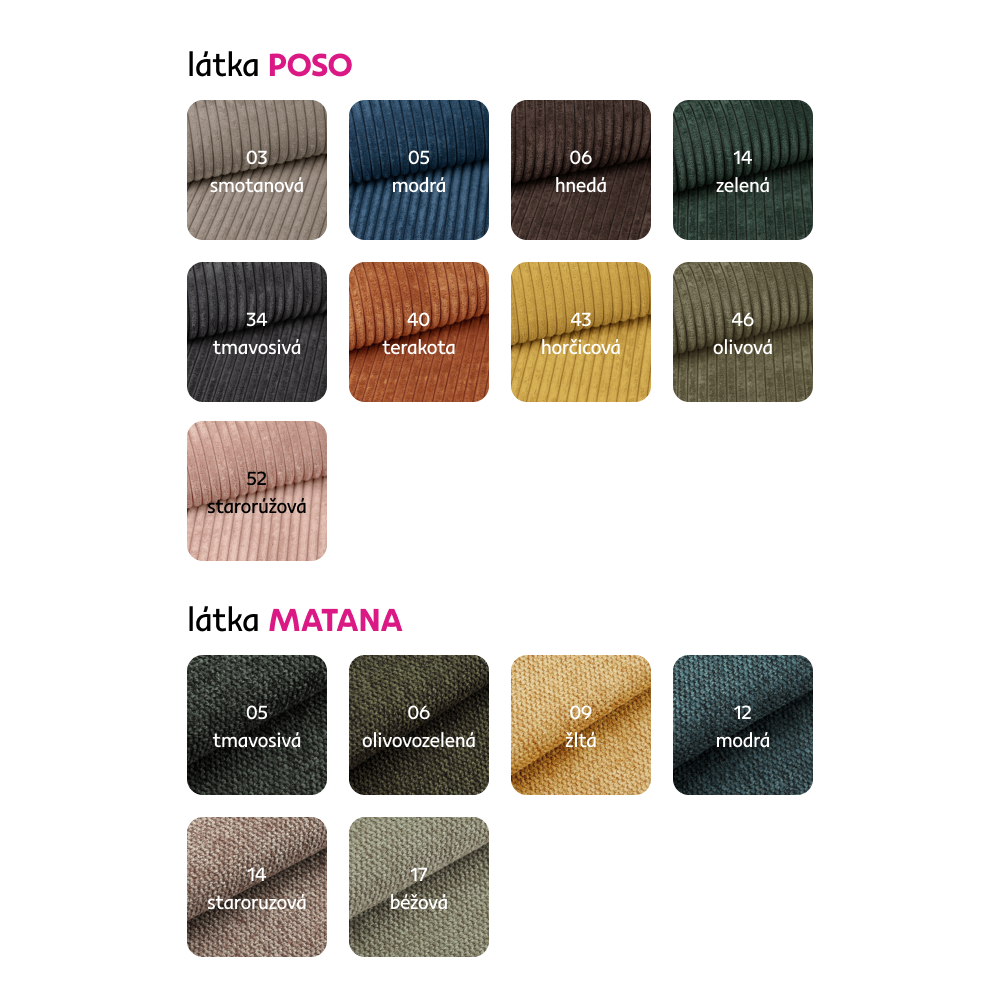 Možnosť objednania v 9 farebných prevedeniach látky Poso a v 6 farebných prevedeniach látky Matana s možnosťou výberu dreva vo farbe čierna alebo buk v cene 169 Eur. Pri individuálnej objednávke je potrebné zaplatiť 20% zálohu z danej sumy. Po uhradení zálohy bude Vaša požiadavka zadaná do výroby. Doba dodania 6-8 týždňov.