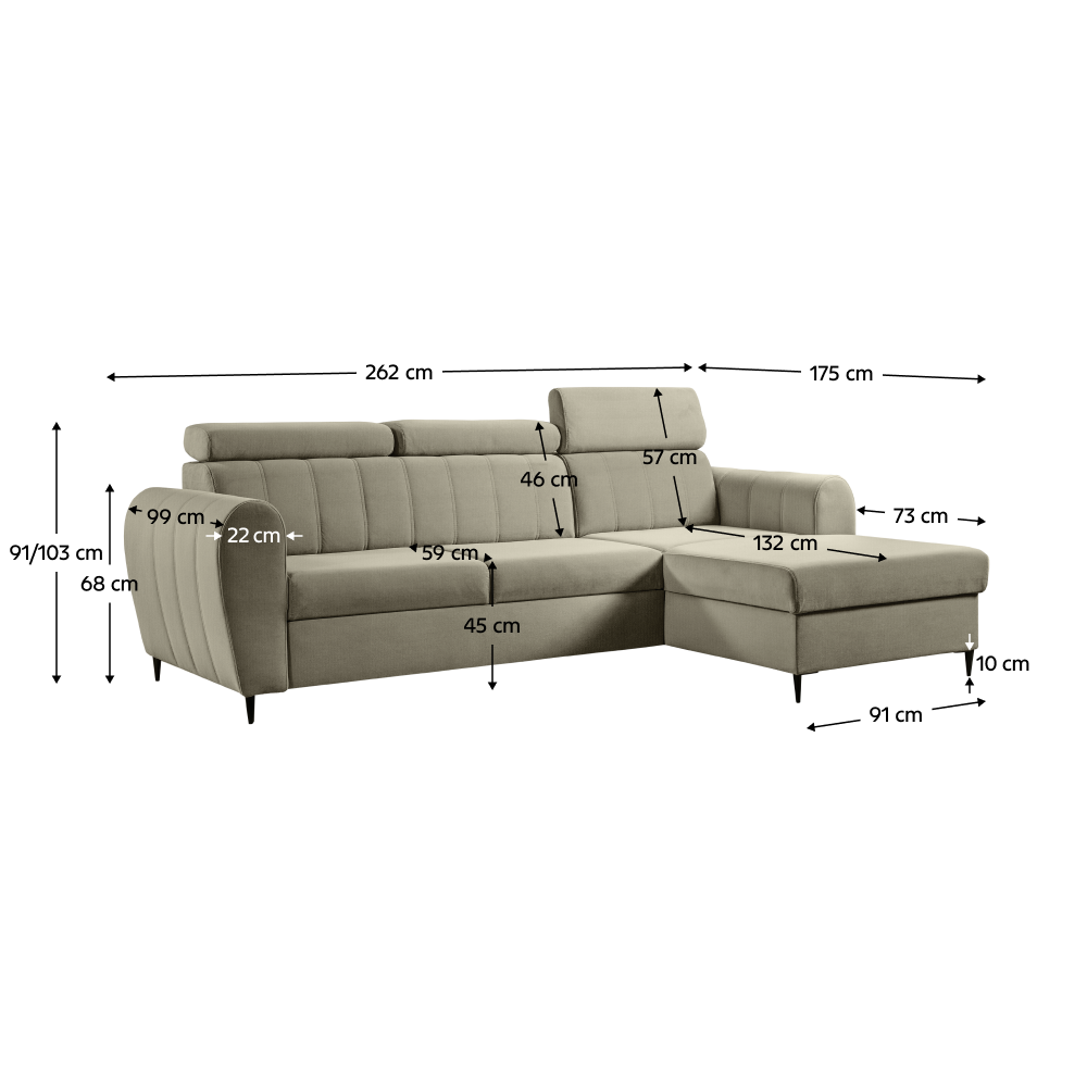 Rozmery (ŠxHxV): 262x175x91/103 cm