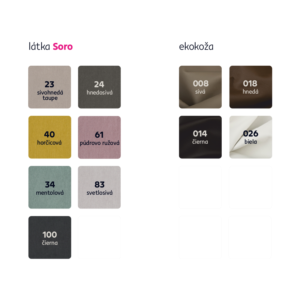Možnosť objednania v 4 farebných prevedeniach ekokože a v 7 farebných prevedeniach látky Soro v cene 1.199 eur. Svoj výber poznačte do poznámky v objednávke. Pri individuálnej objednávke je potrebné zaplatiť 20% zálohu z danej sumy. Po uhradení zálohy bude Vaša požiadavka zadaná do výroby. Dodacia lehota 6-8 týždňov.