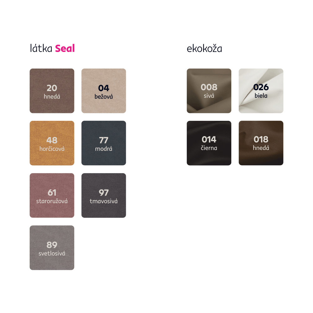 Ponúkame vám možnosť objednať si sedačku v 4 farebných prevedeniach ekokože a v 7 farebných prevedeniach látky Seal v cene: 899 Eur. Pri individuálnej objednávke je potrebné zaplatiť 20% zálohu z danej sumy. Po uhradení zálohy bude Vaša požiadavka zadaná do výroby. Doba dodania 6-8 týždňov.