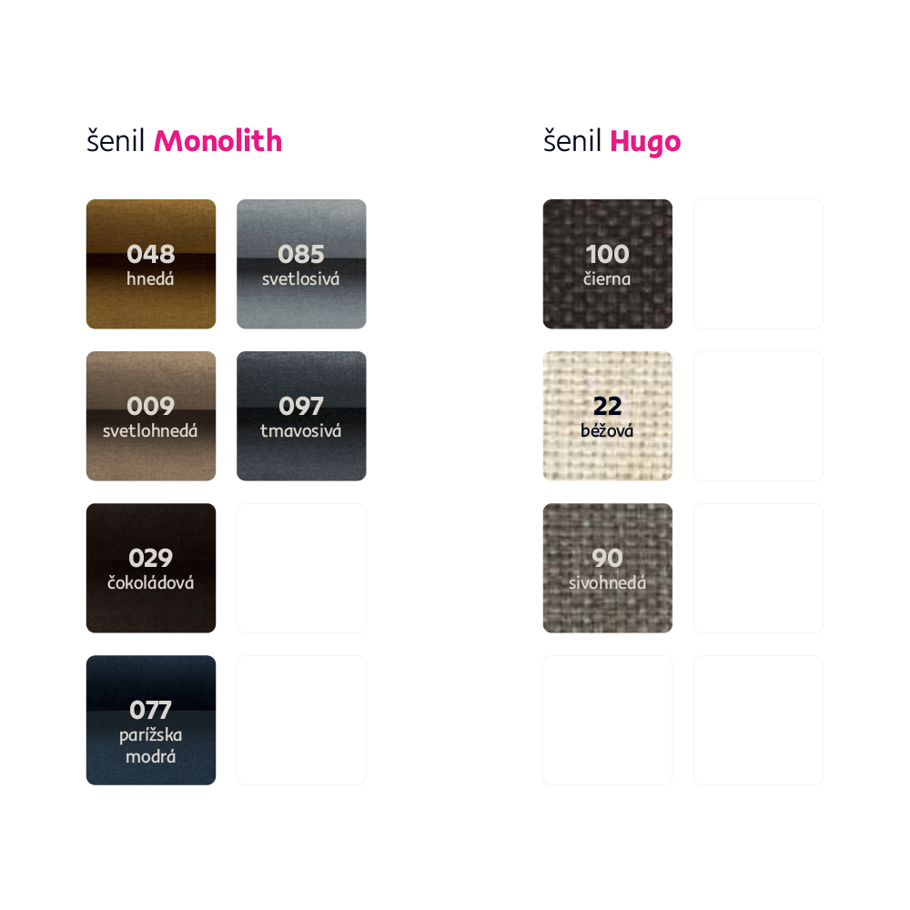 Možnosť objednania v 6 farebných prevedeniach látky Monolith a v 3 farebných prevedeniach látky Hugo/Inari v cene 1.105 Eur. Pri individuálnej objednávke je potrebné zaplatiť 20% zálohu z danej sumy. Po uhradení zálohy bude Vaša požiadavka zadaná do výroby. Doba dodania 6-8 týždňov.
