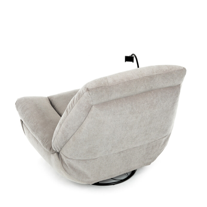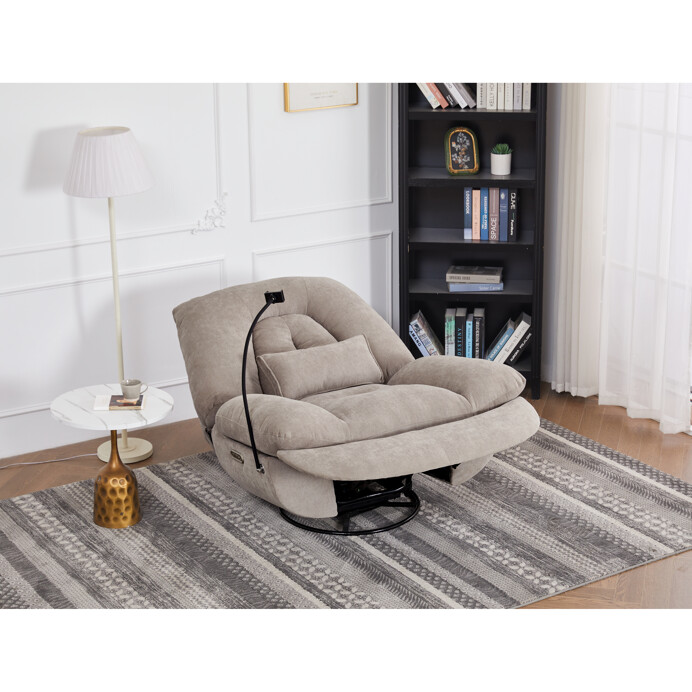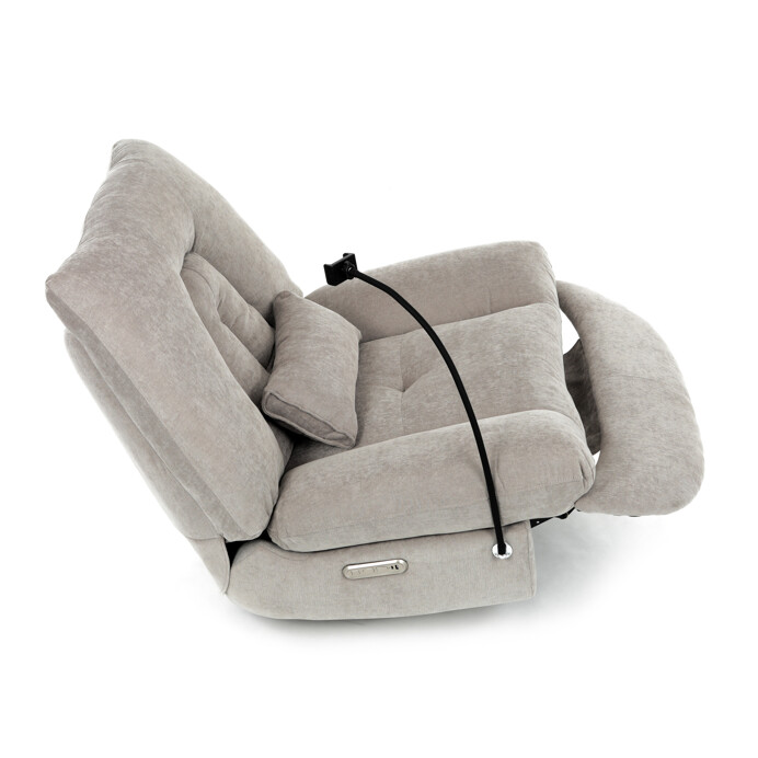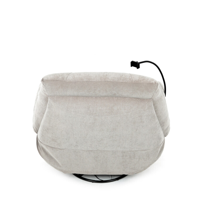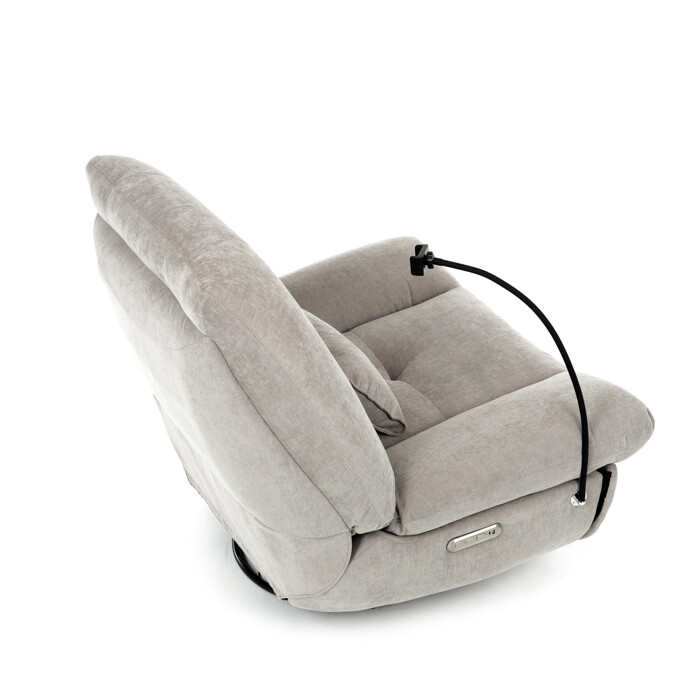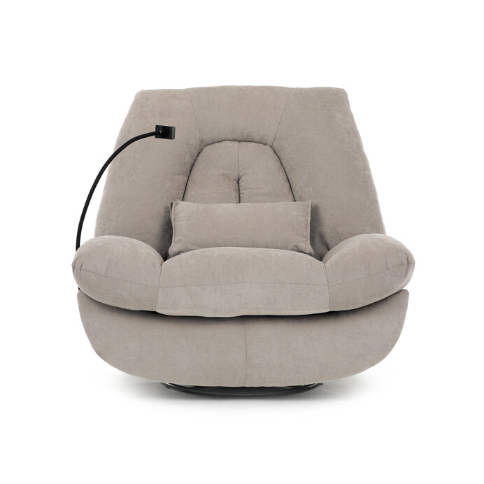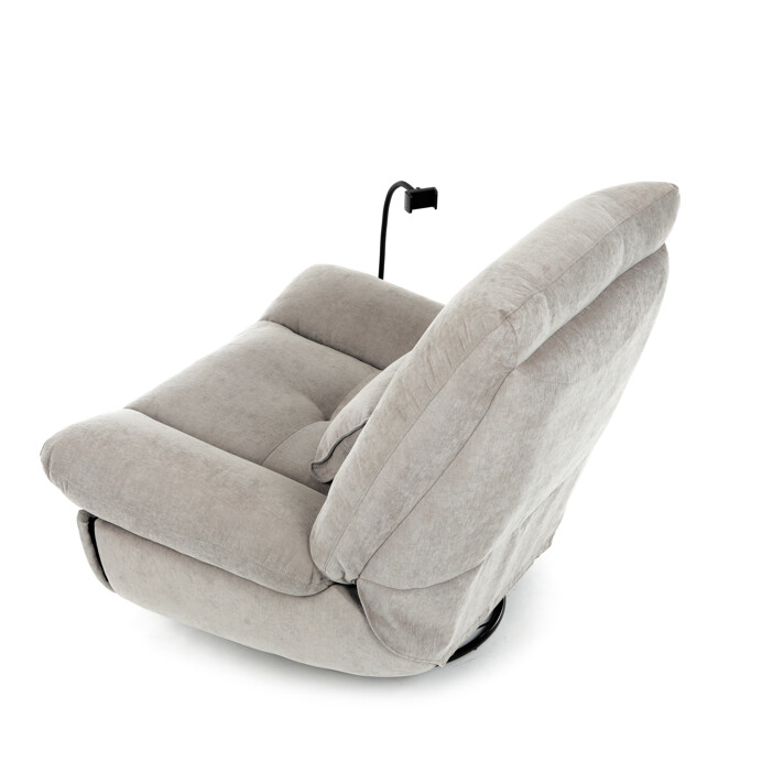 TV kreslo s elektrikom pohovaním v béžovom lanýžovom poťahu učena komfortné sedenie s možnosťou poznávania s pozného szého motora. Kovová podnož umožňuje rotáciu až o 240° a hojdačný pohyb o 30°, čo prispieva k relaxácii a pohodliu. Vstavané ovládanie je doplnené o hlasové ovládanie pre jednoduché nastavenie, zatiaľ čo integrovaný Bluetooth reproduktor zaisťuje kvalitný zvukový doprovod. Medzi praktické funkcie patrí držiak na telefón, porty USB-A a USB-C na nabíjanie zariadení a úložný box na drobné predmety. Pevná konštrukcia s nosnosťou 160 kg a ergonomicky tvarované sedadlo s dlhotrvajúcim komfortom a stabilitou.