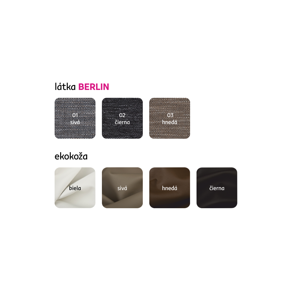 Možnosť individuálnych objednávok sedacej súpravy v 4 farebných prevedeniach ekokože v kombinácii s 3 farebnými prevedeniami látky Berlin v cene 989 Eur. Pri individuálnej objednávke je potrebné zaplatiť 20% zálohu z danej sumy. Po uhradení zálohy bude Vaša požiadavka zadaná do výroby. Dodacia lehota 6-8 týždňov.