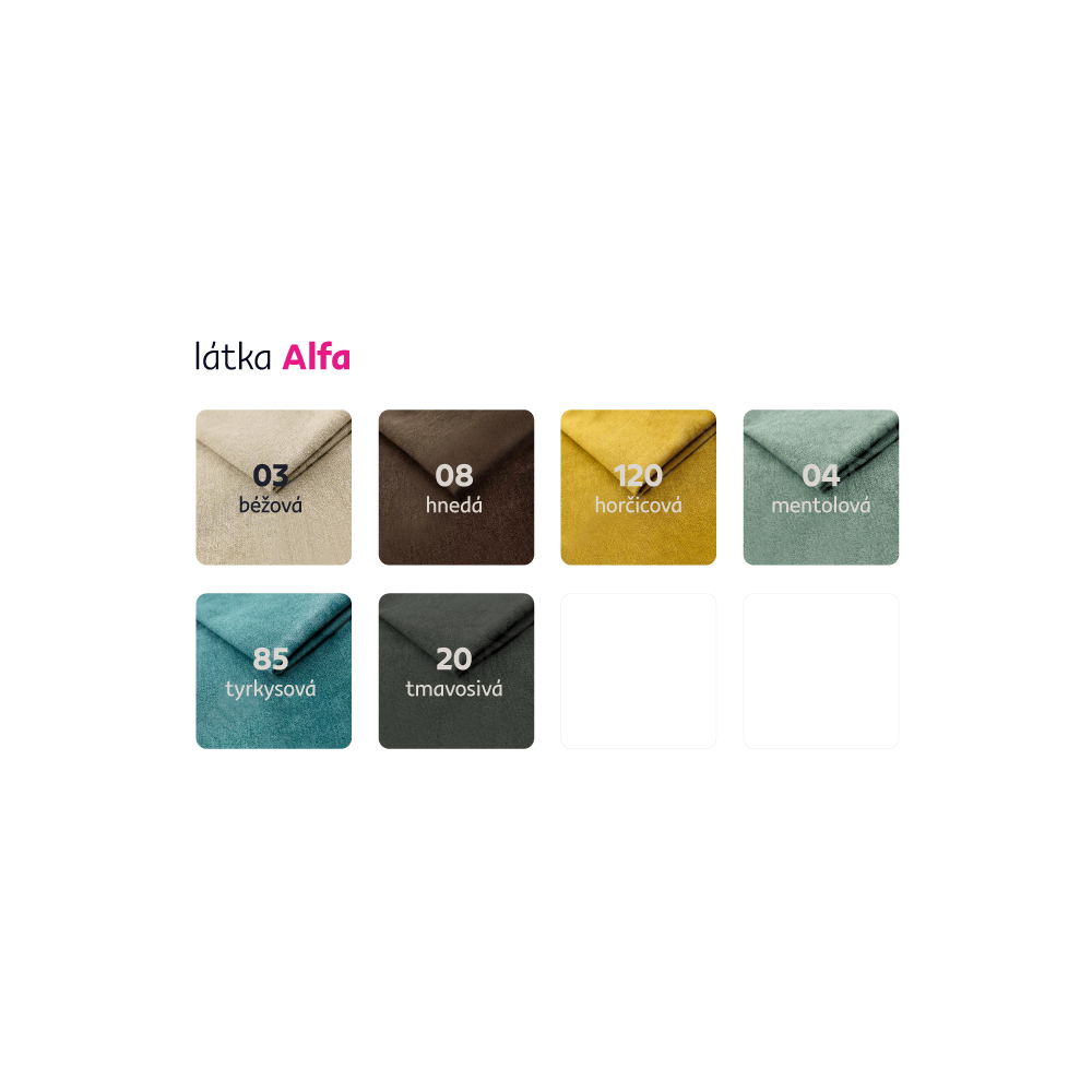 Možnosť objednania v 6 farebných prevedeniach látky Alfa v cene 839 Eur. Pri individuálnej objednávke je potrebné zaplatiť 20% zálohu z danej sumy. Po uhradení zálohy bude Vaša požiadavka zadaná do výroby. Doba dodania 6-8 týždňov.