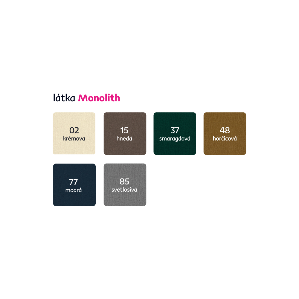 Možnosť objednania v 6 farebných prevedeniach látky Monolith v cene 1679 Eur. Pri individuálnej objednávke je potrebné zaplatiť 20% zálohu z danej sumy. Po uhradení zálohy bude Vaša požiadavka zadaná do výroby. Doba dodania 6-8 týždňov.