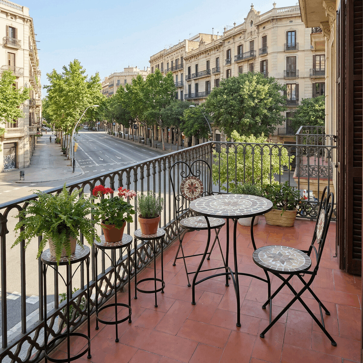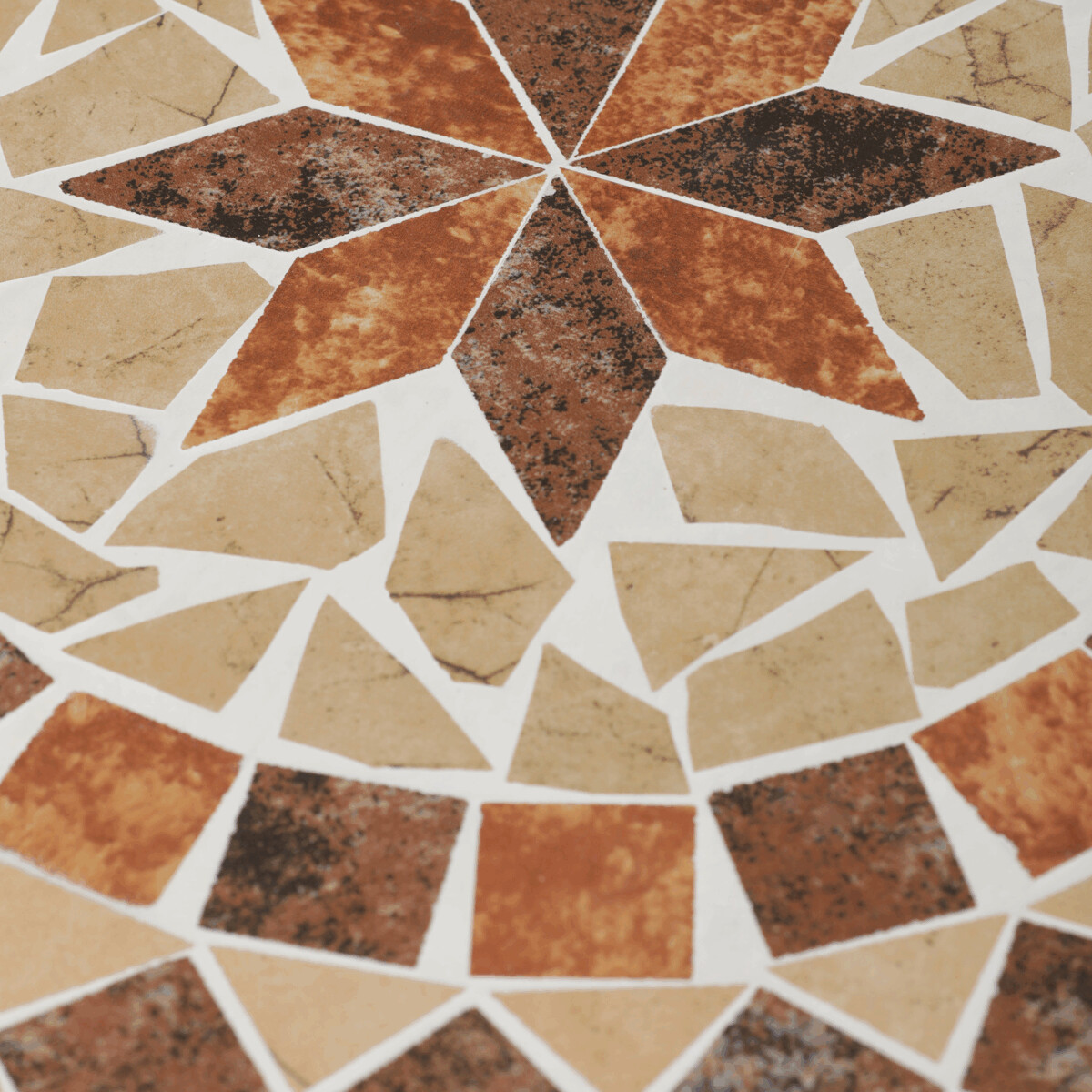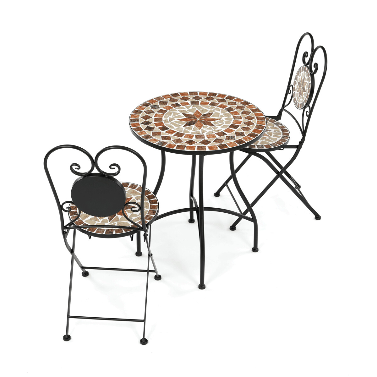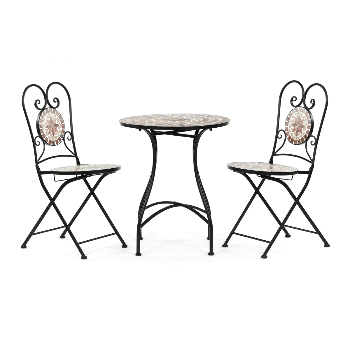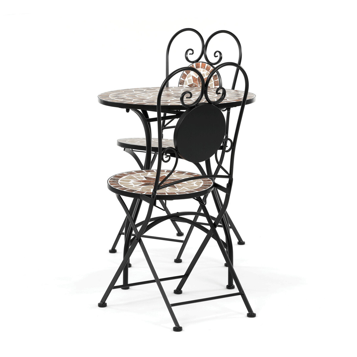 Záhradná zostava pozostávajúca z okrúhleho stola a dvoch stoličiek kombinuje pevnú kovovú konštrukciu s dekoratívnou keramickou mozaikou na doskách. Kovové nohy stola aj stoličiek sú tvarované do elegantných oblúkov a zdobené jemnými kovanými detailmi, ktoré dodávajú celku ľahkosť a stabilitu. Keramická mozaika v prírodných a teplých odtieňoch vytvára výrazný vizuálny efekt a zároveň sa ľahko udržiava. Zostava je vhodná na vonkajšie použitie na balkónoch či terasách, kde poskytuje pohodlné sedenie pre dve osoby. Vďaka kombinácii materiálov je navrhnutá pre dlhú životnosť a odolnosť voči poveternostným vplyvom.