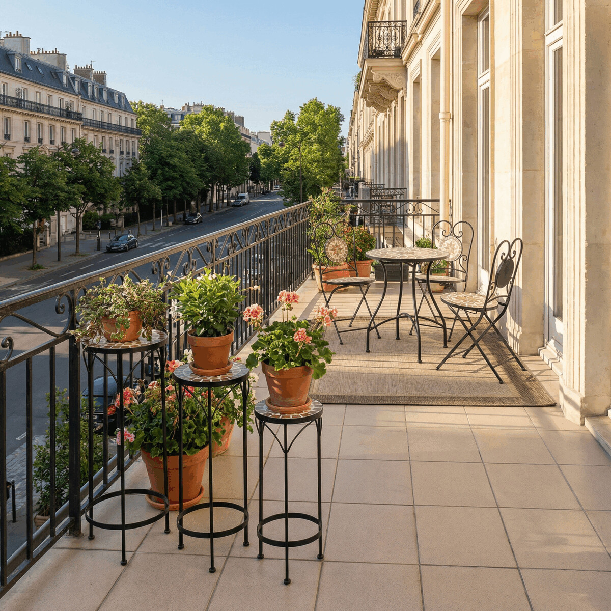 Sada troch stojanov na kvety kombinuje pevnú kovovú podnož s keramickou doskou zdobenou krémovou mozaikou, ktorá vytvára jemný dekoratívny prvok. Každý stojan má inú výšku, čo umožňuje variabilné usporiadanie rastlín a zaujímavú priestorovú kompozíciu. Kovová podnož je navrhnutá pre stabilitu a dlhú životnosť, zatiaľ čo keramická doska je ľahko udržiavateľná a odolná voči poveternostným vplyvom. Vďaka elegantnému spojeniu materiálov a prírodných odtieňov stojany vyniknú ako v interiéri, tak na terase či balkóne. Vhodné na vystavenie kvetín rôznych veľkostí a typov nádob.