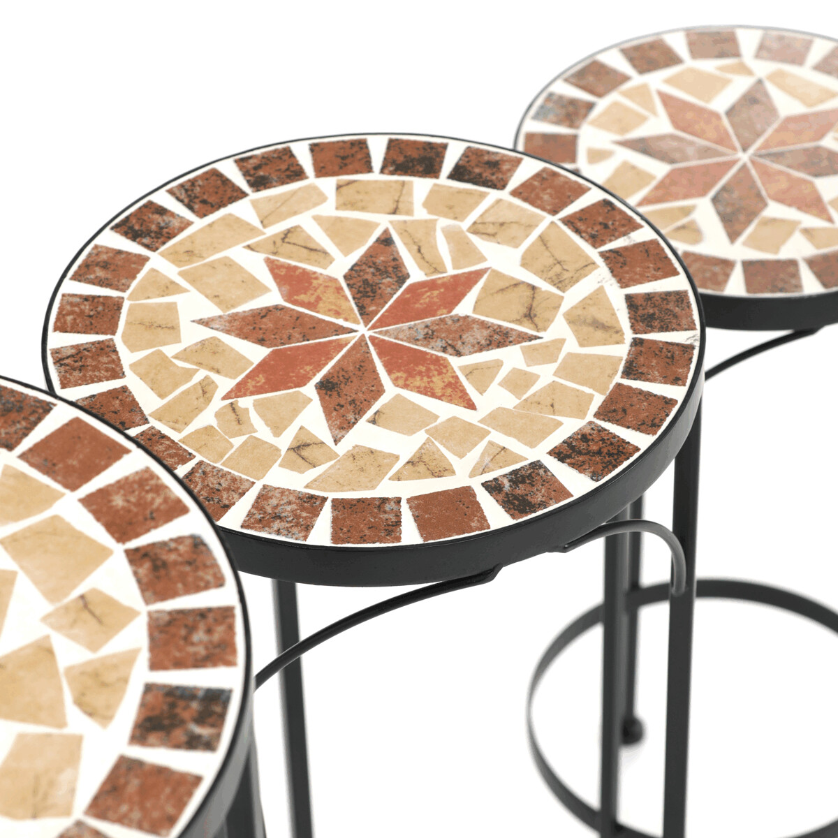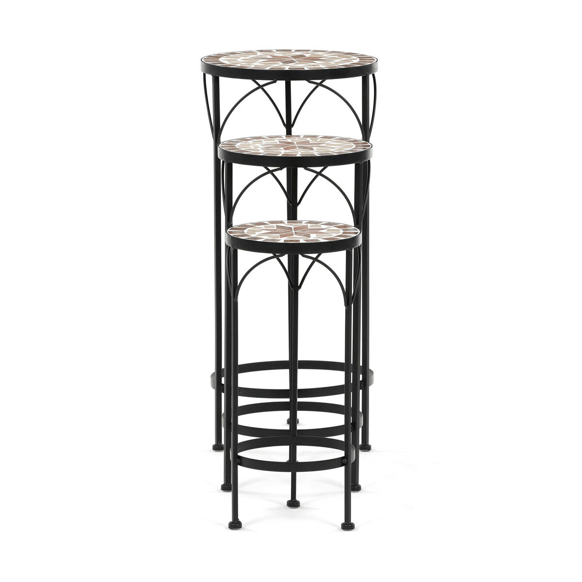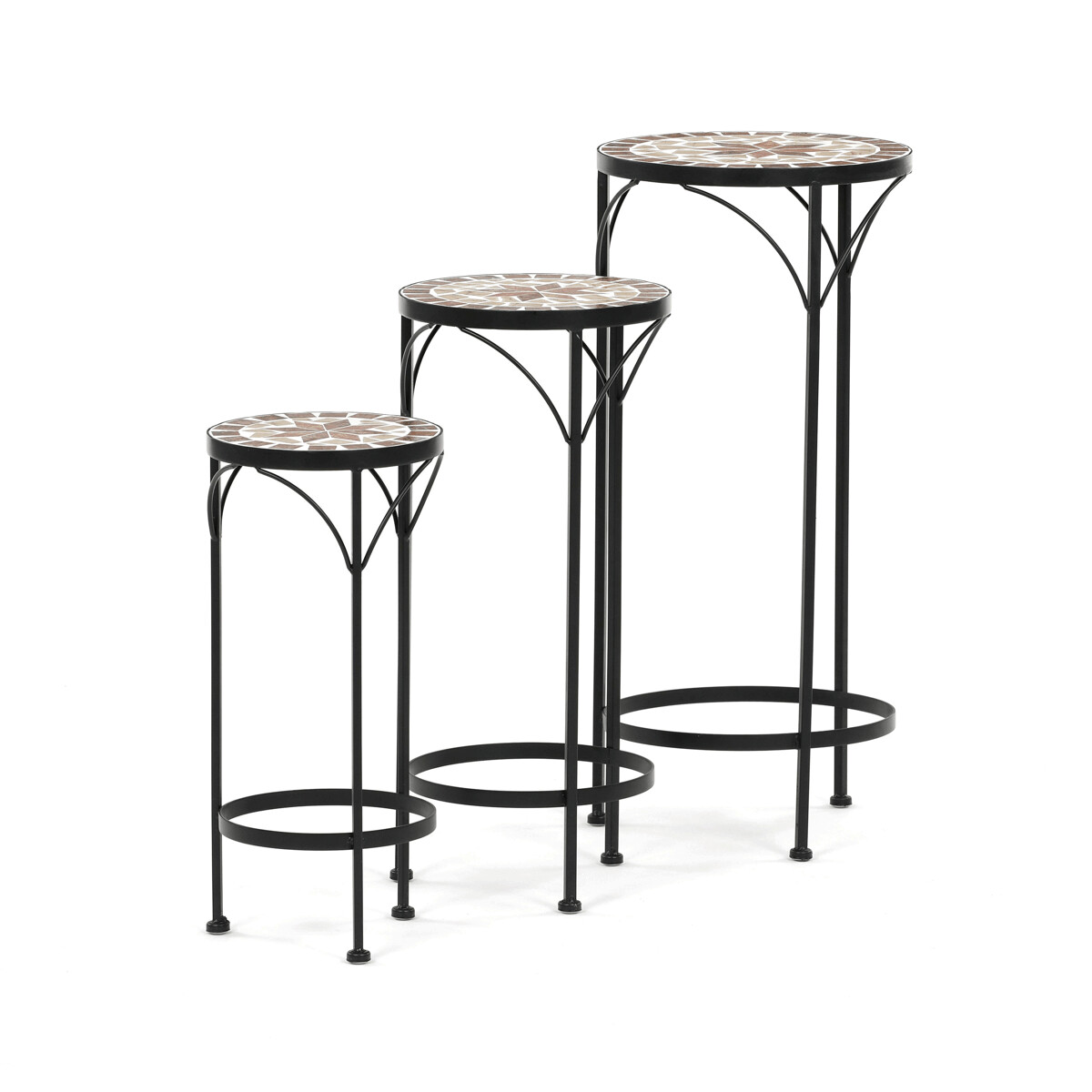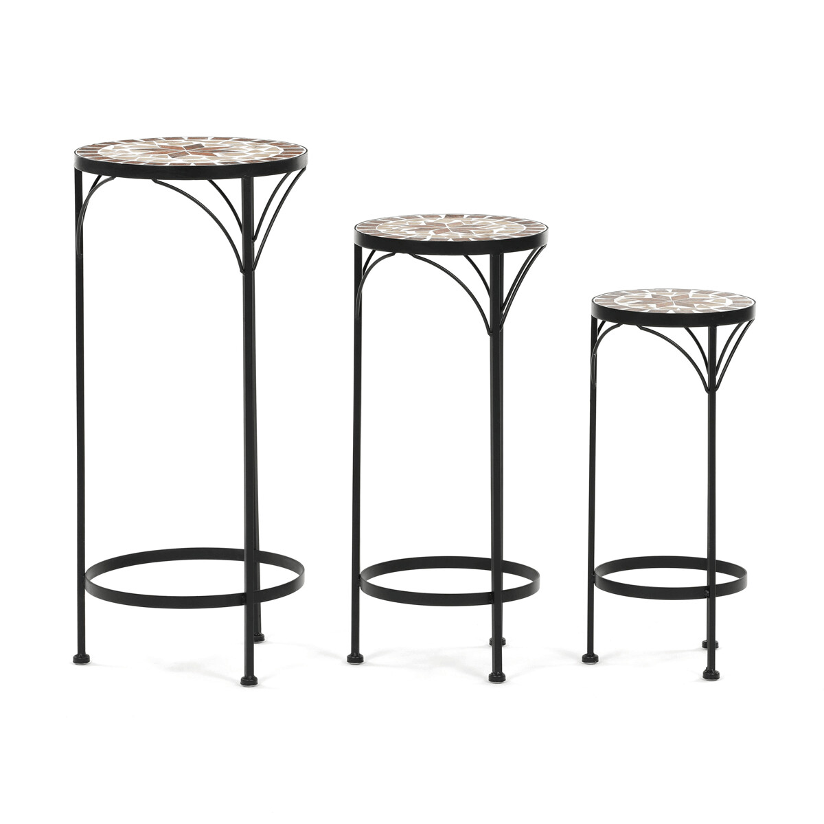 Sada troch stojanov na kvety kombinuje pevnú kovovú podnož s keramickou doskou zdobenou krémovou mozaiko...zobraziť celý popis produktu