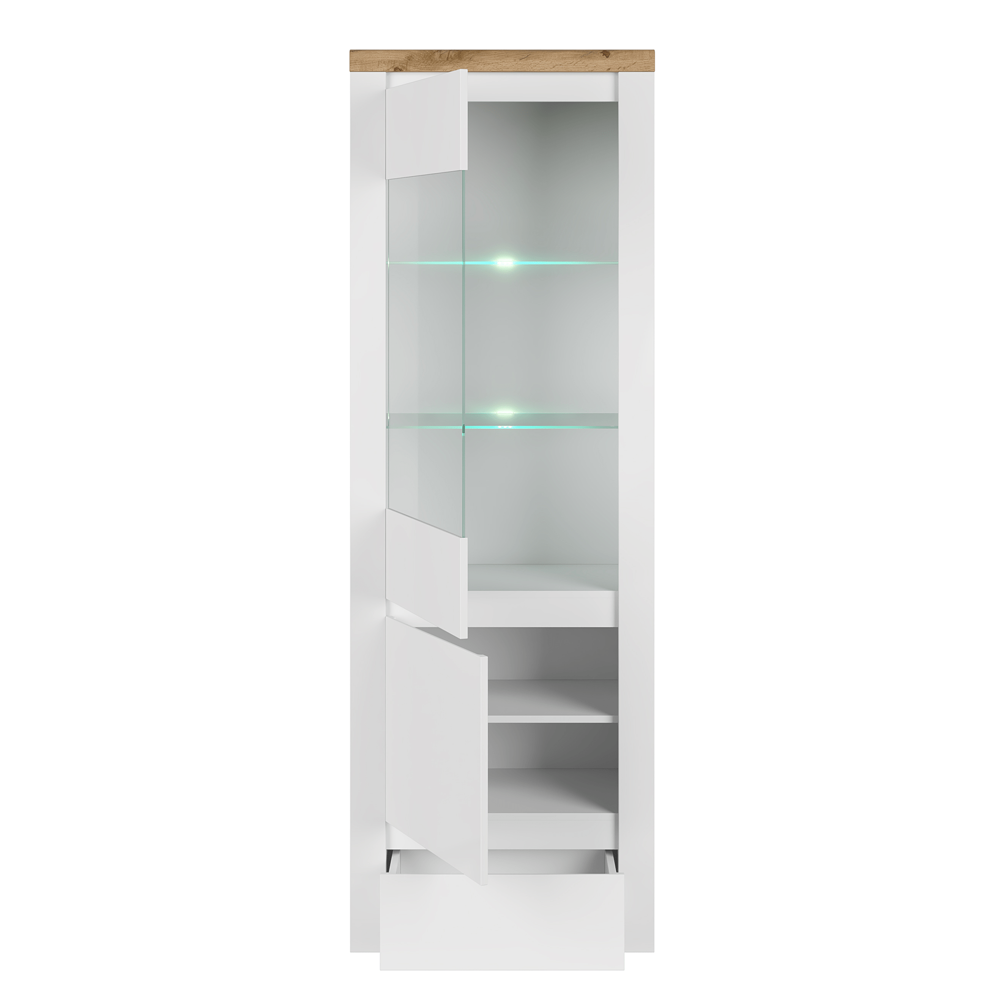 Obsahuje dvierka so sklom a dve sklenené police
