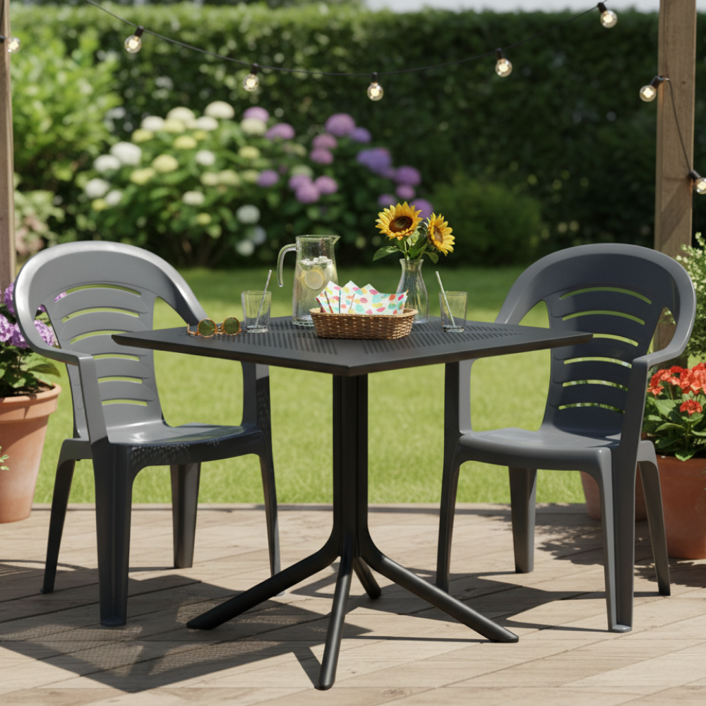 Materiál: plast Farba: antracit Rozmery (ŠxHxV): 55,5x42x87 cm Výška sedu: 42 cm Hĺbka sedu: 40 cm Šírka sedu:55,5 cm Šírka chrbta: 45 cm Výška chrbta: 45 cm Nosnosť: 100 kg Otvory na odtok vody Stohovateľné Ľahké skladovanie Záhradné Dodávané v monte