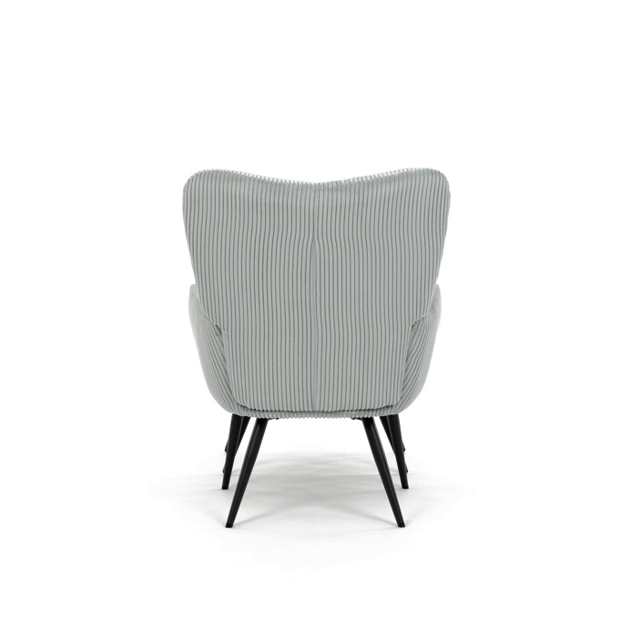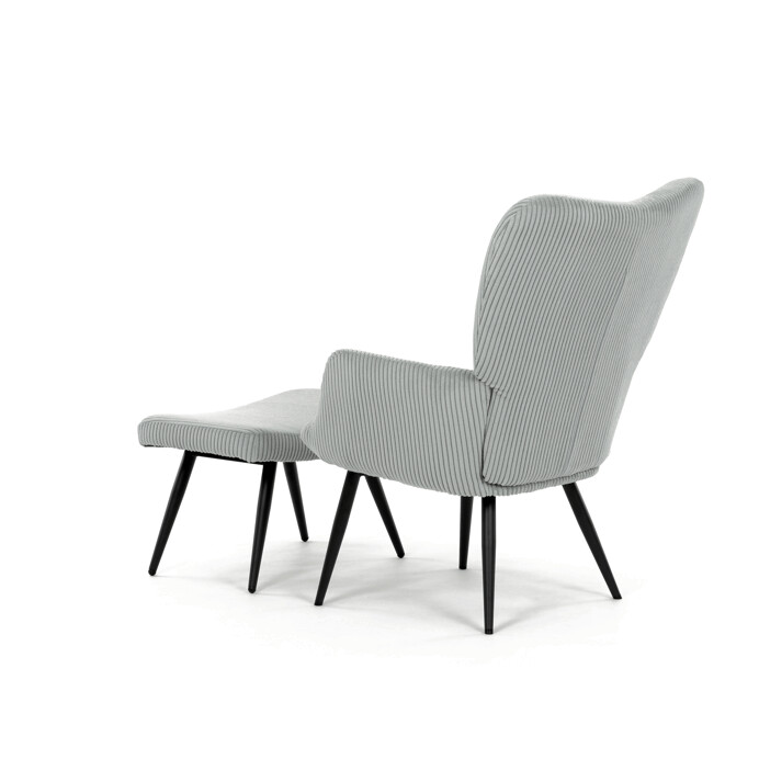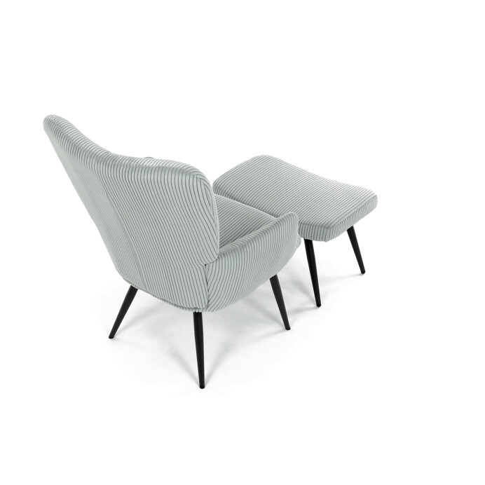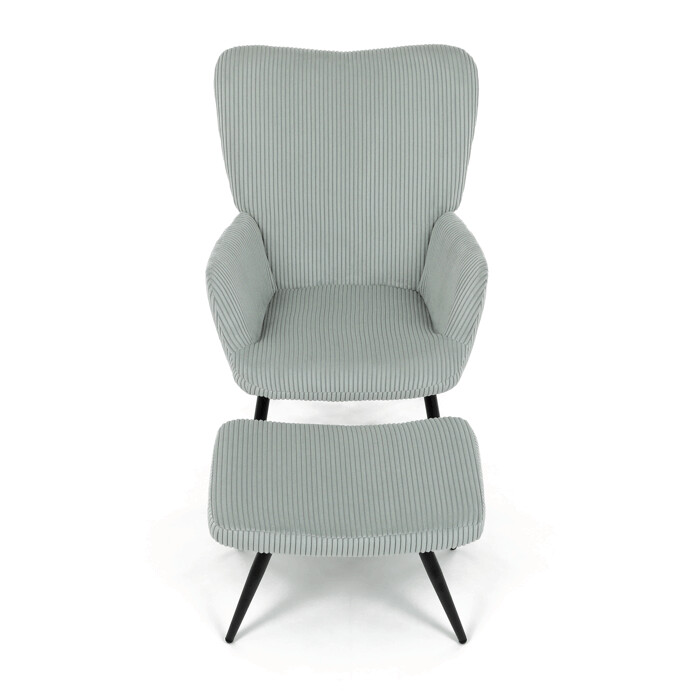 Relaxačné kreslo s podnožkou v modrom manšestru ponúka pohodlné sedenie vďaka mäkkému čalúneniu a ergonomicky tvarovaným podrúčkam. Pevné čierne kovové nohy zabezpečujú stabilitu a dlhú životnosť. Manšestrová látka dodáva kreslu príjemnú textúru a vizuálnu hĺbku, ktorá sa hodí do moderných aj klasických interiérov. Súčasťou je praktický taburet na pohodlné oprenie nôh, ktorý zdieľa rovnaký dizajn a materiál. Kreslo nie je otočné ani rozkladacie, čo podčiarkuje jeho jednoduchosť a funkčnosť.