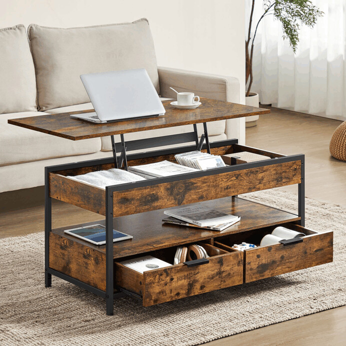 Konferenčný stolík AKF-E1252 OLW kombinuje praktický úložný priestor s industriálnym dizajnom v odtieni old wood. Doska stola je vyrobená z MDF s povrchovou úpravou pripomínajúcou staré drevo, ktorá dodáva stolíku rustikálny charakter a jednoduchú údržbu. Pevná kovová podnož zabezpečuje stabilitu a dlhú životnosť, zatiaľ čo výklopná horná doska odhaľuje priestranný úložný priestor vhodný na uloženie časopisov, diaľkových ovládačov alebo iných drobností. Dve spodné zásuvky s kovovými úchytkami dopĺňajú funkčnosť stolíka a umožňujú organizáciu menších predmetov. Rozmery 50x100x48-63 cm poskytujú dostatok priestoru pre pohodlné použitie v obývacej izbe.