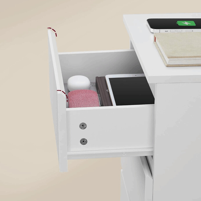 Nočný stolík ANT-E1161 WT v bielom prevedení je vyrobený z MDF dosiek s hladkým povrchom v bielej farbe, ktorá ľahko zapadne do moderných aj klasických interiérov. Disponuje tromi zásuvkami bez úchytiek, ktoré sú vybavené tichým dojazdom pre pohodlné a nerušené používanie. Praktickou funkciou je elektrická zásuvka a USB port umiestnené na hornej doske stolíka, ktoré umožňujú pohodlné nabíjanie elektronických zariadení priamo pri posteli. Kompaktné rozmery a pevné prevedenie zabezpečujú stabilitu a dostatok úložného priestoru pre osobné veci. Vďaka jednoduchému dizajnu a bielej farbe je stolík univerzálnym doplnkom spálne s dôrazom na funkčnosť.