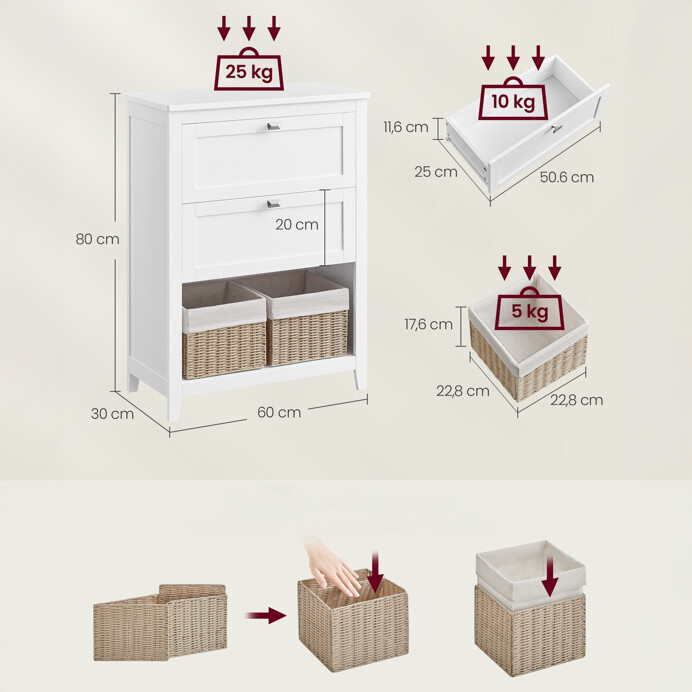 Kúpeľňová skrinka v oblátkovo bielej farbe je vyrobená z MDF dosiek s hladkým povrchom, ktorý sa ľahko udržiava. Ponúka praktický úložný priestor vo forme dvoch zásuviek s decentnými kovovými úchytkami a otvoreného priestoru s dvoma košíkmi z prírodnej ľanovej tkaniny a plastu, ktoré umožňujú organizáciu drobných predmetov. Stabilné nožičky zabezpečujú pevnosť a odolnosť nábytku, zatiaľ čo kompaktné rozmery 60 × 30 × 80 cm umožňujú umiestnenie aj do menších priestorov. Skrinka kombinuje funkčnosť s jednoduchým dizajnom vhodným do moderných kúpeľní.