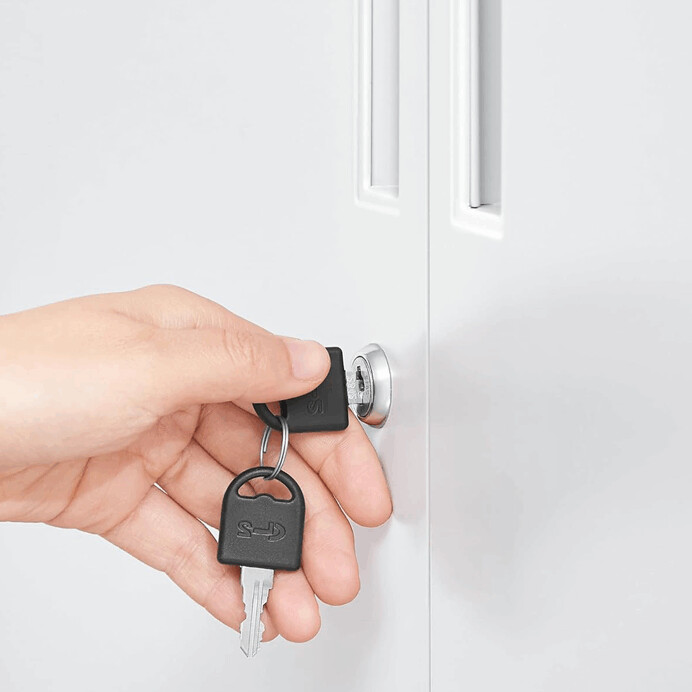 Úložná skrinka s rozmermi 80x40x100 cm je vyrobená z pevného kovu s práškovou povrchovou úpravou v bielej farbe, ktorá zabezpečuje odolnosť proti poškodeniu a jednoduchú údržbu. Skrinka ponúka tri vnútorné police, ktoré poskytujú dostatok priestoru na organizáciu rôznych predmetov, a je vybavená dvoma dverami s integrovanými úchytkami pre pohodlné otváranie. Kovové nožičky s nastaviteľnými pätkami zaručujú stabilitu aj na nerovnom povrchu. Praktický zámok na pravých dverách umožňuje bezpečné uzamknutie obsahu. Vďaka svojmu jednoduchému dizajnu a neutrálnej bielej farbe sa skrinka hodí do kancelárií aj domácich priestorov.