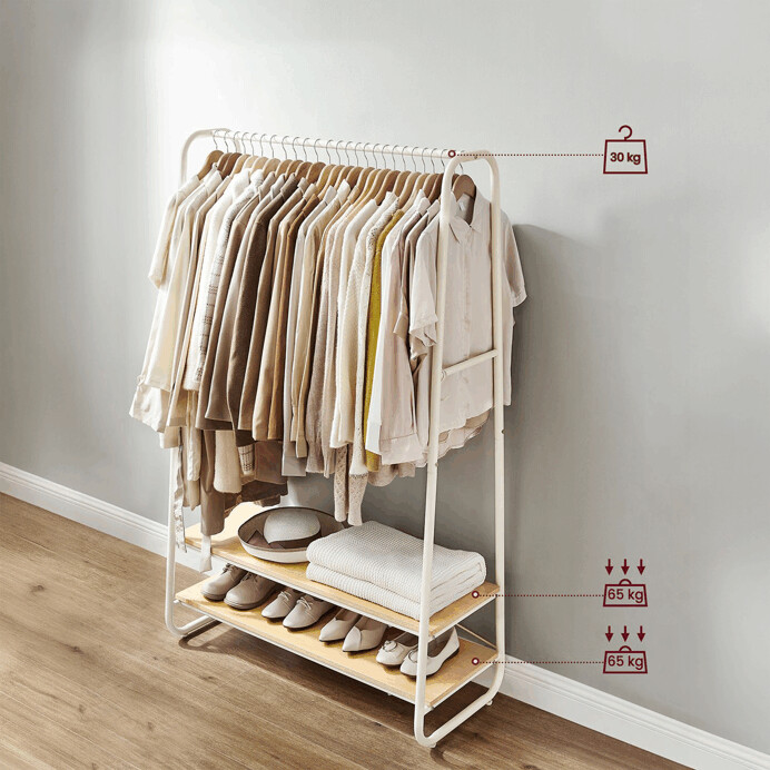 Vešiak s dvoma policami v bielom prevedení kombinuje pevnú kovovú konštrukciu s praktickými policami z MDF s dubovým dekorom, ktoré poskytujú dostatok úložného priestoru na obuv alebo doplnky. Stabilný rám je navrhnutý v nadčasovom dizajne s oblými hranami, čo zabezpečuje bezpečné a pohodlné používanie. Horná časť vešiaka ponúka dostatočnú dĺžku na zavesenie odevov na ramienka, zatiaľ čo po stranách sú umiestnené kovové háčiky na zavesenie menších predmetov. Povrchová úprava kovu je hladká a ľahko udržiavateľná, čo prispieva k dlhej životnosti produktu. Rozmery a nosnosť zodpovedajú bežným požiadavkám na domáce aj komerčné použitie.