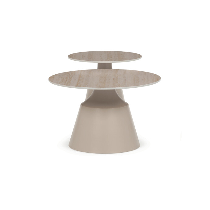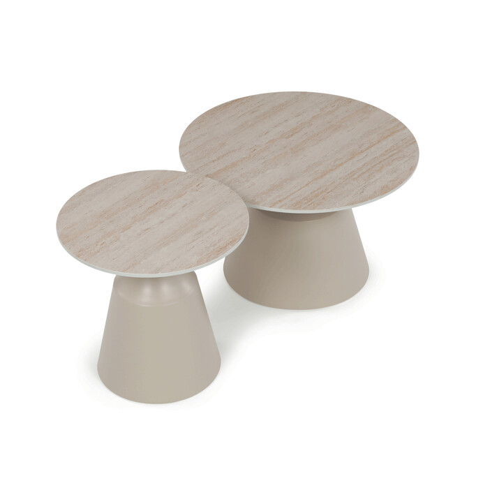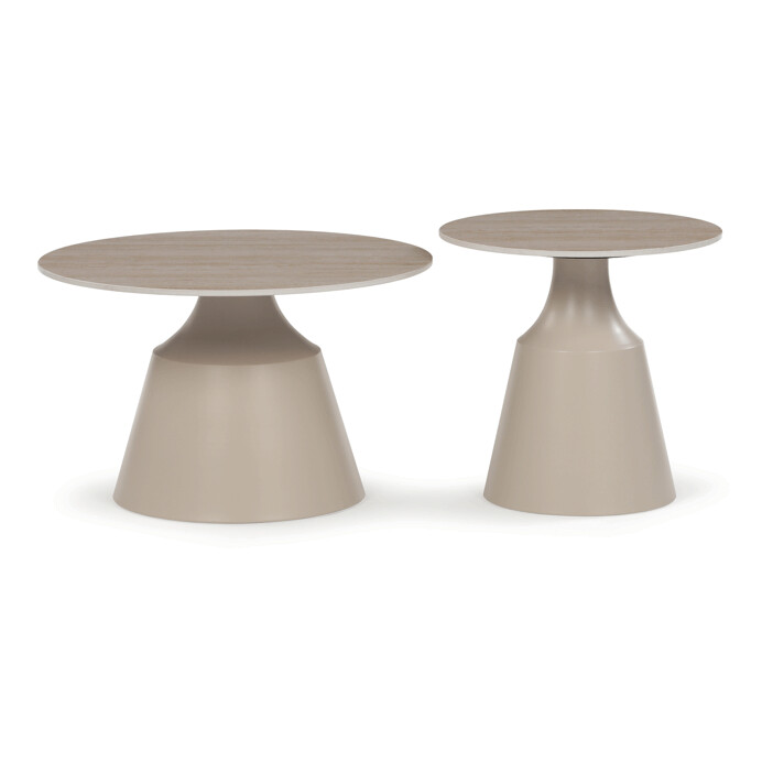 Sada dvoch konferenčných stolov v béžovom odtieni kombinuje keramické dosky s matnou povrchovou úpravou a stabilné kovové podnože, ktoré zabezpečujú pevnosť a dlhú životnosť. Väčší stôl má priemer 70 cm a výšku 43,5 cm, menší potom priemer 50 cm a výšku 48,5 cm, čo umožňuje variabilné usporiadanie v priestore. Keramická doska je odolná voči poškriabaniu a ľahko sa udržiava, čo prispieva k praktickému využitiu v moderných interiéroch. Kovová podnož je navrhnutá pre stabilitu a bezpečné umiestnenie na rôznych typoch podláh. Dizajn stolov s jemným travertínovým vzorom dodáva priestoru prírodný a zároveň súčasný vzhľad.
