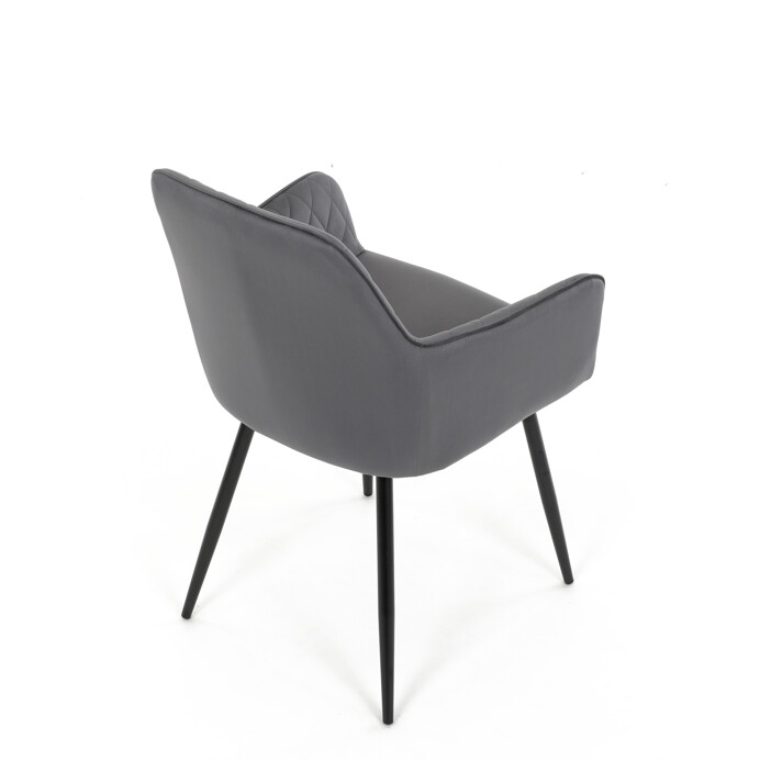 Jedálenská stolička s poťahom zo sivej zamatovej látky ponúka príjemný dotyk a vizuálne zaujímavý dizajn vďaka prešívaniu v kosoštvorcovom vzore na operadle aj podrúčkach. Pevné kovové nohy v čiernom matnom prevedení zabezpečujú stabilitu a dlhú životnosť. Ergonomicky tvarované operadlo s integrovanými podrúčkami podporuje pohodlné sedenie počas dlhších jedál aj stretnutí. Sedák je dostatočne široký a vyplnený mäkkou výplňou, ktorá prispieva k pohodliu. Stolička je vhodná do moderných aj klasických interiérov, kde vynikne jej kombinácia zamatu a kovu.