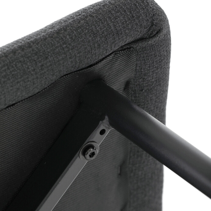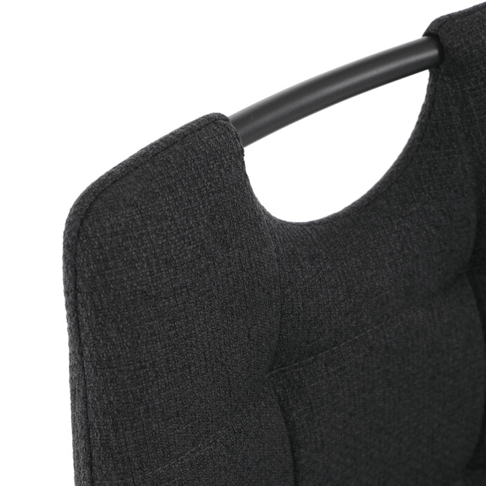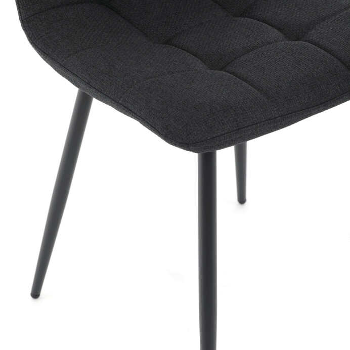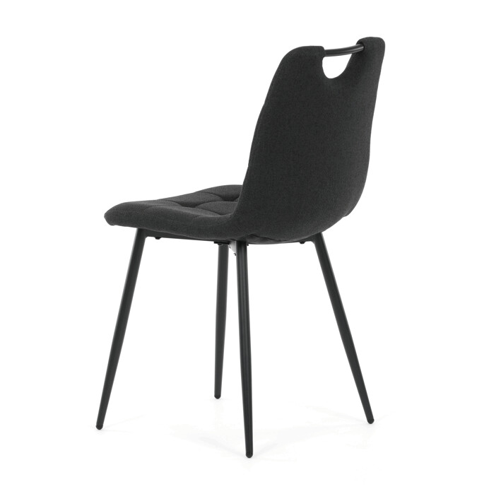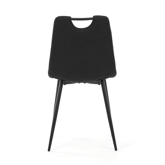 Jedálenská stolička s označením DCL-V2017 BK2 spája moderný dizajn s praktickými detailmi. Sedák a operadlo sú potiahnuté čiernou látkou, ktorá sa ľahko udržiava a je doplnená dizajnovým prešitím pre zvýraznenie estetického dojmu. Čierne kovové nohy s matnou povrchovou úpravou zabezpečujú stabilitu a pevnosť celej stoličky. Súčasťou operadla je praktické madlo, ktoré uľahčuje manipuláciu a prenášanie stoličky. Stolička nemá podrúčky ani otočný mechanizmus, čo ju robí vhodnou do jedálenských priestorov s obmedzeným miestom.