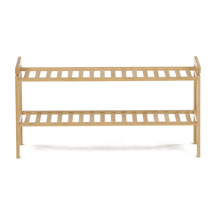 Botník s dvoma policami je vyrobený z masívneho bambusu v prírodnom odtieni, ktorý zabezpečuje pevnosť a dlhú životnosť. Otvorená polica s vodorovnými latkami umožňuje efektívne vetranie a rýchle schnutie obuvi. Jednoduchý a funkčný dizajn botníka sa hodí do rôznych interiérov, kde ponúka praktické riešenie na uskladnenie topánok. Stabilný rám a rovné nohy zaručujú bezpečné a pevné postavenie. Rozmery botníka umožňujú uloženie viacerých párov obuvi bez zbytočnej náročnosti na priestor.