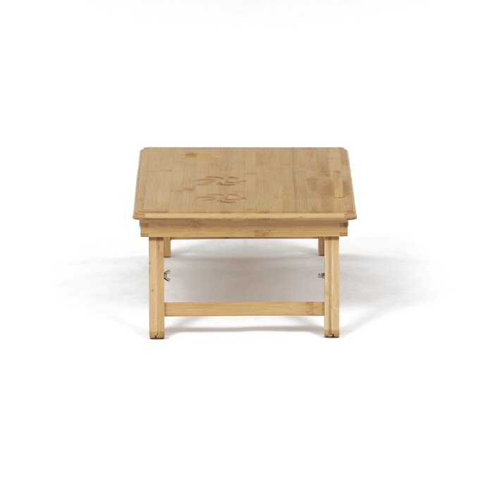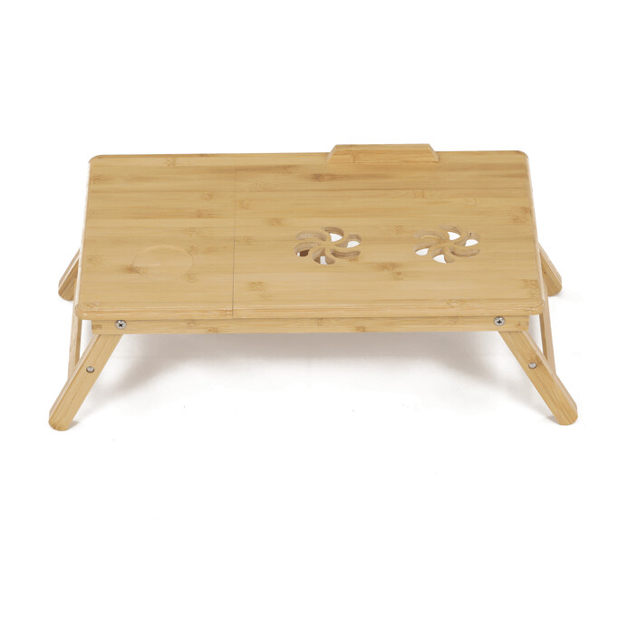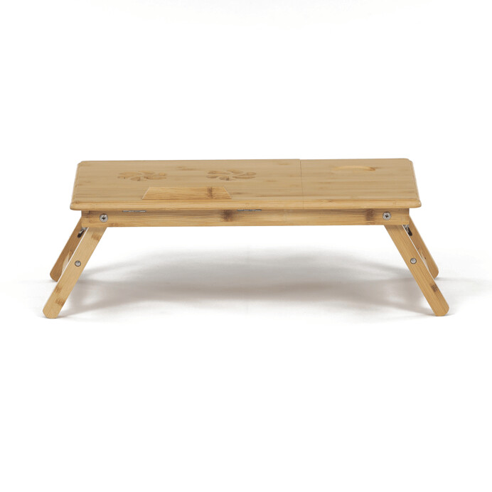Skladací stolík na notebook z masívneho bambusu v prírodnom odtieni ponúka praktické a estetické riešenie pre prácu aj oddych. Doska stolíka je rozdelená na dve časti, pričom hlavná časť je nastaviteľná do niekoľkých uhlov a vybavená ventilačnými otvormi pre lepšie chladenie zariadenia. Vedľajšia plocha slúži ako odkladací priestor napríklad na myš alebo šálku. Pevné nohy z masívneho bambusu sú vybavené protišmykovými koncovkami a umožňujú jednoduché skladanie pre úsporu miesta pri skladovaní či preprave. Vďaka kvalitnému prírodnému materiálu sa stolík ľahko udržiava a je navrhnutý pre dlhú životnosť.