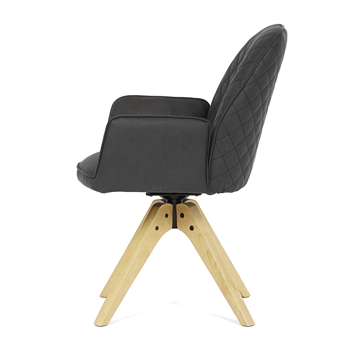 Jedálenská stolička s podrúčkami potiahnutá v textílii imitujúca brúsenú kožu. Chrbát a operadlo sú efektne prešité v tvare diamantu. Farba prešitia je vo farbe poťahového materiálu. Nohy sú z lakovaného jaseňového dreva. Sedák otočný P90 ° L 90 ° s vratným mechanizmom - funkcia reset.