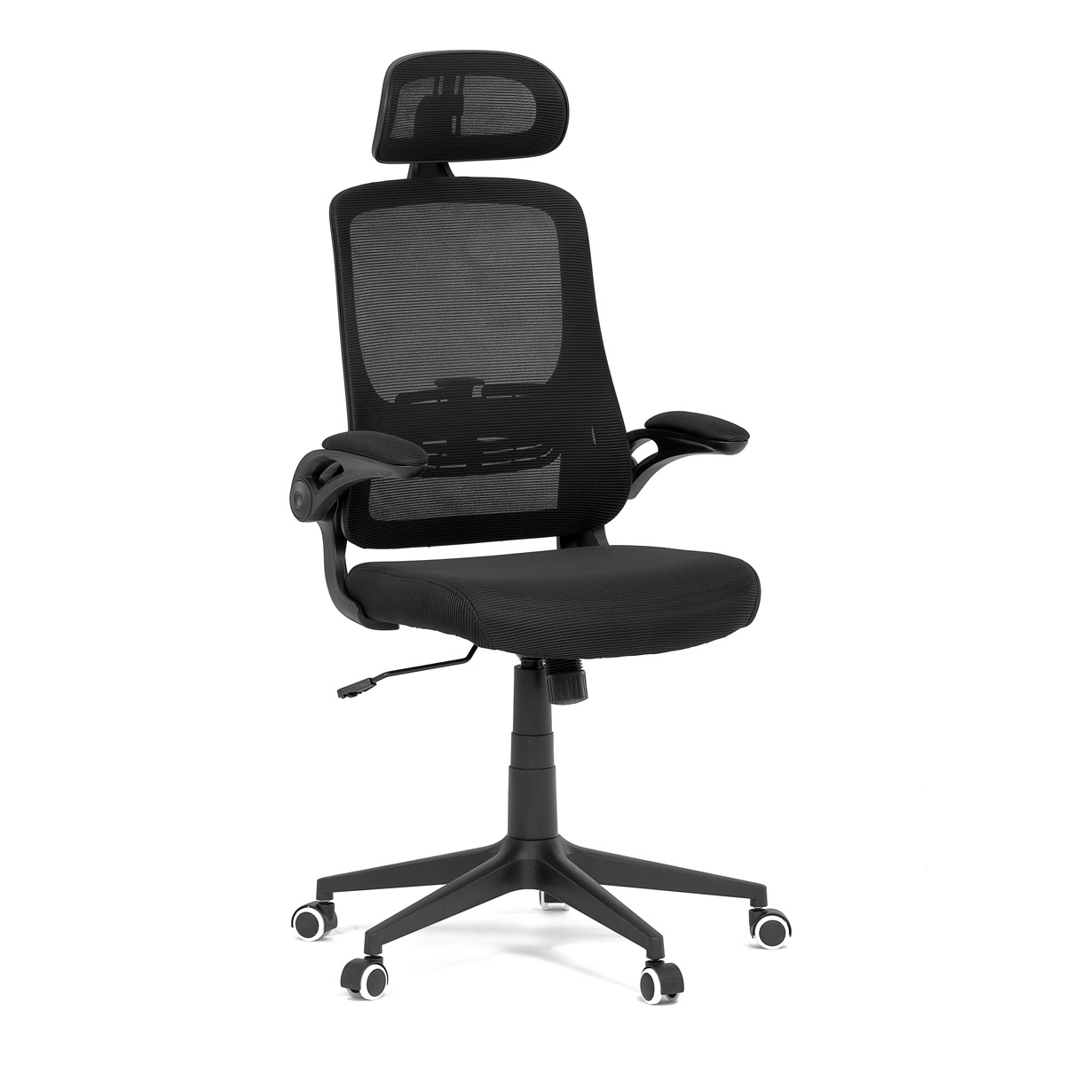 Kancelárska stolička v čiernej látke. Sedák a povrch zdvíhacích madiel je vystlaný a potiahnutý čiernou látkou. Výškovo nastaviteľný podhlavník. Kostra, podrúčky a kríž sú z odolného plastu.