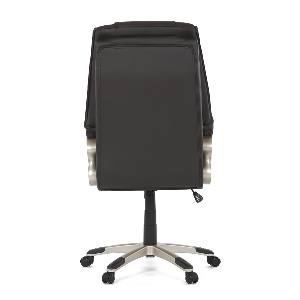 Manažérske kreslo v poťahu z tmavo hnedej ekokože. Kríž a podrúčky sú z odolného plastu v medenej farbe. Vrchná časť podrúčiek krytá mäkkým madlom v tmavo hnedej ekokoži. Pri kresle sú použité kolieska pre tvrdé povrchy.
