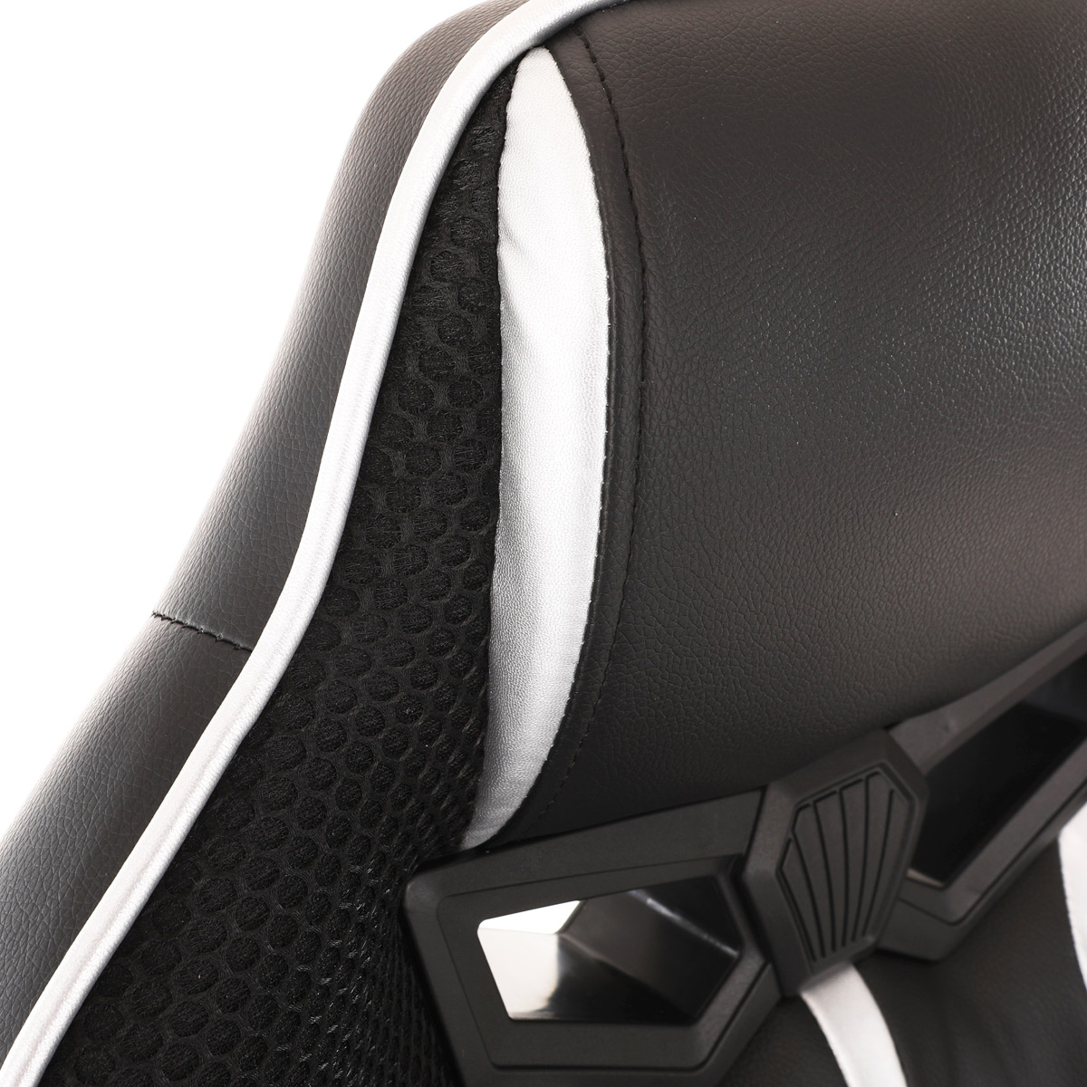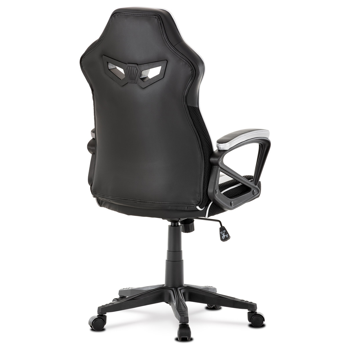 Elegantné herné kreslo v dizajne sedačky závodného vozidla v prevedení Dark Racing Style so zaoblenými líniami vo výraznom kontraste s ostro rezanými rysmi plastového lemovania otvorov na „bezpečnostné pásy“. Uprostred sú spojené výrazným prvkom v štylizovanom tvare mušle. Tieto dizajnové otvory v hornej časti operadla nielen potrebný závodný vzhľad, ale aj uľahčuje manipuláciu. Poťah je kombináciou čiernej látky MESH, doplnený väčšími prvkami z čiernej a striebornej ekokože. Obvodové prešitie je v čiernej farbe. Polstrovanie je z kvalitnej PU peny. Stolička je vybavená hojdacím mechanizmom s nastavením protiváhy a aretáciou v základnej polohe. Tuhosť protiváhy je možné regulovať veľkou plastovou skrutkou, umiestnenou pod sedákom. Výška sedenia sa upravuje páčkou na pravej strane cez kvalitný plynový piest. Znavené ruky z celodenného hrania či práce si môžete pohodlne položiť na podrúčky, na ložnej ploche polstrovanej čiernou a na obvodovej striebornou ekokožou. Šírka podrúčiek je 8 cm, ložná plocha 36 cm a výška 3 cm. Operadlo je vyššie, s integrovanou statickou opierkou hlavy. Kríž je veľký čierny plastový s priemerom 64 cm, čo zaisťuje dokonalú stabilitu aj pri fyzicky náročnejších hrách. Na koncoch ramien kríža sú v čiernej farbe výrazné protišmykové plochy. Kolieska sú plastové pr. 5 cm s čiernou obvodovou gumou, vhodná na tvrdé podlahy. Nosnosť stoličky je až 130 kg. Táto stolička nesklame a zaručí pohodlie aj pohodu pri akejkoľvek činnosti, kde ju bude potrebné a ešte bude v interiéri vďaka svojim decentným tvarom a farebnosti neprehliadnuteľným prvkom.