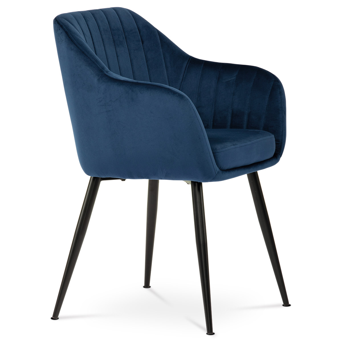 Dokonalý dizajn, industriálny štýl a perfektné pohodlie je pre túto stoličku samozrejmosťou. Škrupina sedadla i operadla má pevnú kovovú kostru, poťah z veľmi kvalitnej zamatovej látky v matnom prevedení a luxusnom odtieni NAVY modrej. Polstrovanie je z PU peny. Bonusom na zvýšenie pohodlia posedu je 8 cm zvýšený a extra polstrovaný sedák a praktické pohodlné opierky s opornou plochou vo výške 69 cm od podlahy. Príjemný dekoratívny prvok vytvárajú zvislé prešitie vnútorných častí operadla aj bokov. Použitá látka je veľmi odolná a perfektne sa čistí. Stabilitu stoličky zaisťujú štyri kónické kovové nohy s kvalitným práškovým nástrekom v čiernej matnej farbe. Ukončené sú čiernymi plastovými klzákmi, zabraňujúci poškodeniu tvrdých povrchov podláh. Nohy majú kruhový prierez s priemerom od 2 do 3,5 cm v hornej časti. Všetky tieto plus produkujú z tohto modelu skvelú voľbu pre Váš výber zariadení jedálenských alebo obývacích priestorov, ale skvele sa hodia aj ako konferenčné stoličky do zasadacích miestností. Nosnosť stoličky je až 120 kg. Základné rozmery sú - celková šírka 58 cm, celková hĺbka 57 cm, celková výška 84 cm, výška sedu 52 cm a hĺbka sedu 43 cm.