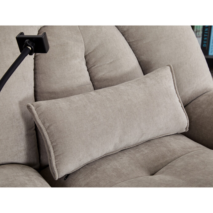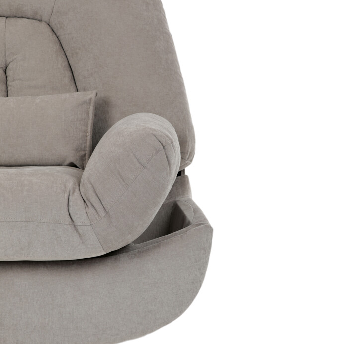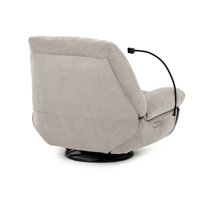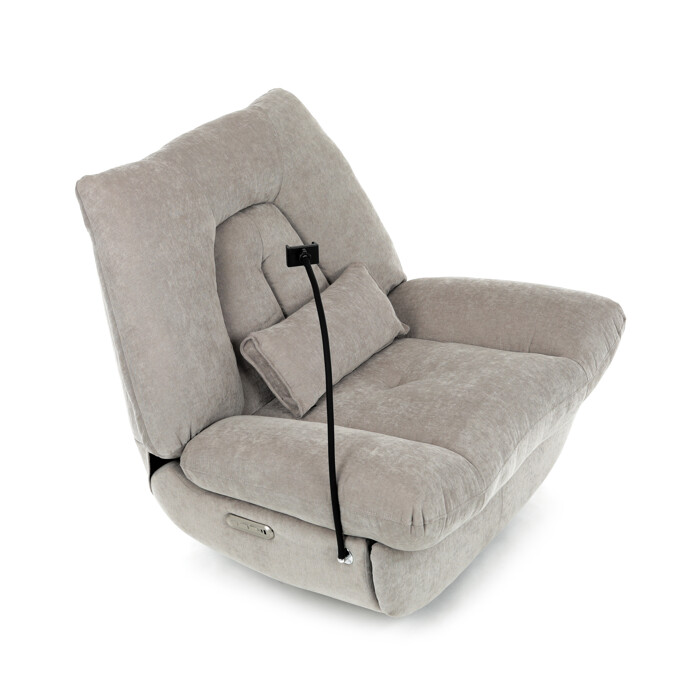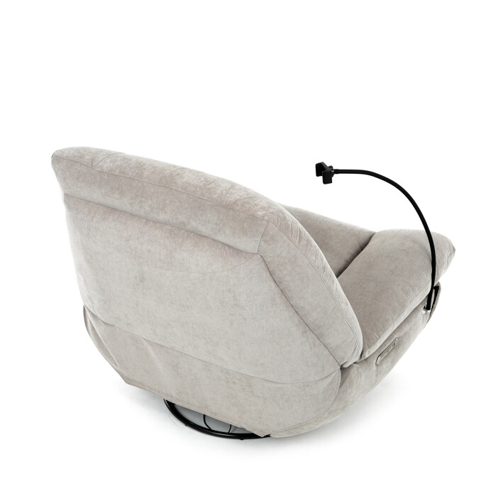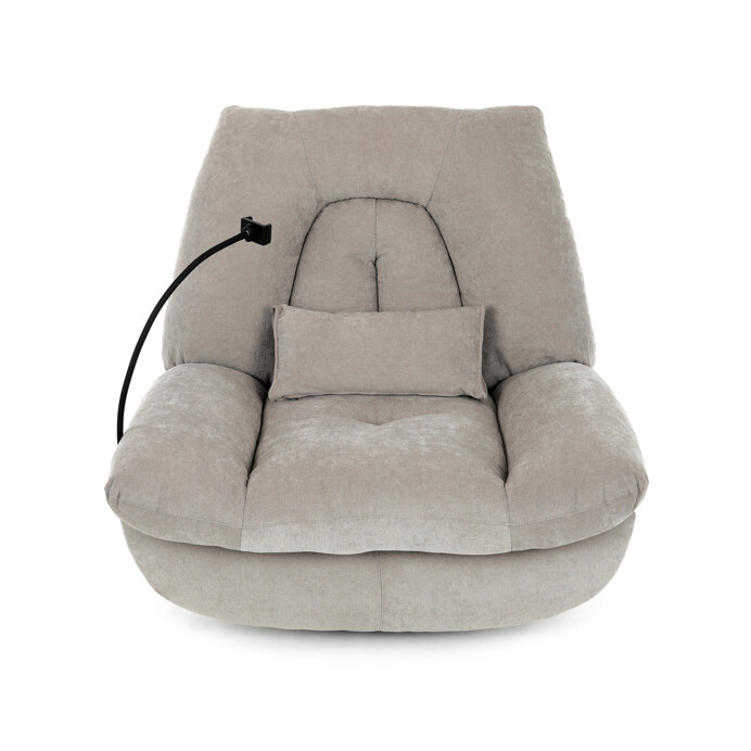 TV kreslo s elektrikom pohovaním v béžovom lanýžovom poťahu učena komfortné sedenie s možnosťou poznávania s pozného szého motora. Kovová podnož umožňuje rotáciu až o 240° a hojdačný pohyb o 30°, čo prispieva k relaxácii a pohodliu. Vstavané ovládanie je doplnené o hlasové ovládanie pre jednoduché nastavenie, zatiaľ čo integrovaný Bluetooth reproduktor zaisťuje kvalitný zvukový doprovod. Medzi praktické funkcie patrí držiak na telefón, porty USB-A a USB-C na nabíjanie zariadení a úložný box na drobné predmety. Pevná konštrukcia s nosnosťou 160 kg a ergonomicky tvarované sedadlo s dlhotrvajúcim komfortom a stabilitou.