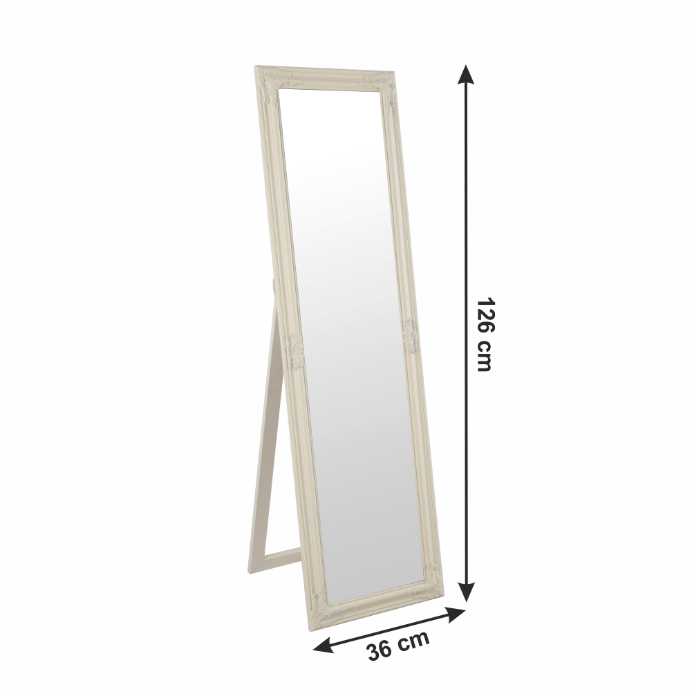 Elegantné zrkadlo s dreveným rámom smotanovej farby. Rozmery zrkadla (ŠxV) 36x126 cm. Hmotnosť: 6,5 kgzobraziť celý popis produktu